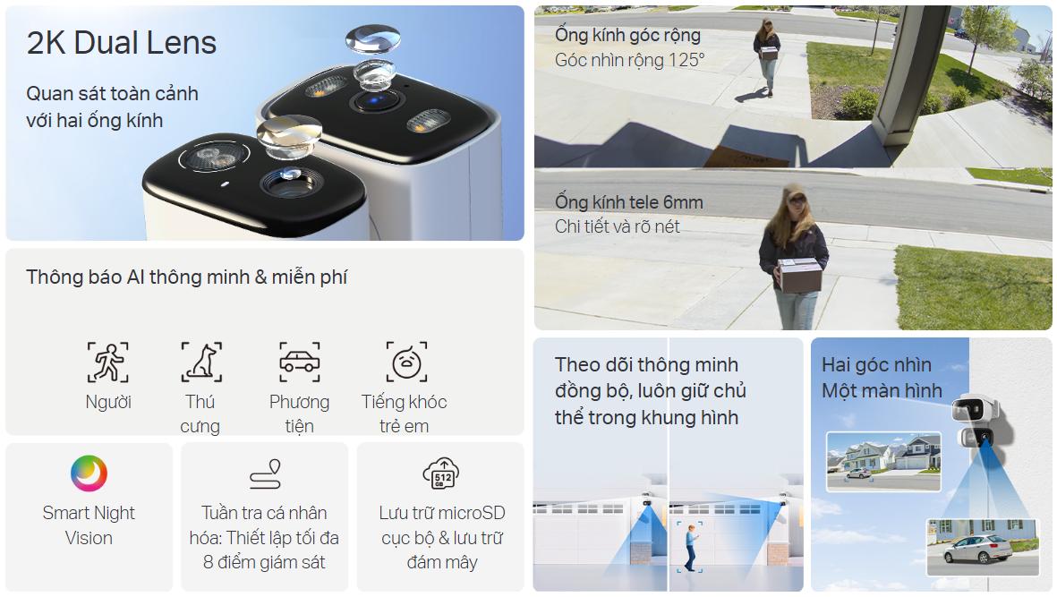 • AI thông minh: Phát hiện chuyển động, người, thú cưng, phương tiện, vượt hàng rào, tiếng khóc trẻ, vỡ kính, tiếng chó mèo, phá hoại camera