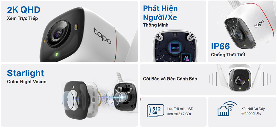 Camera TP-LINK Tapo C320WS là dòng camera an ninh ngoài trời nổi bật với khả năng ghi hình 2K QHD 4MP siêu nét cùng công nghệ Full Color cho hình ảnh có màu sống động cả ban đêm. Trang bị cảm biến Starlight độ nhạy sáng cao kết hợp đèn trợ sáng thông minh, thiết bị giúp giám sát rõ ràng trong mọi điều kiện ánh sáng. Camera hỗ trợ phát hiện chuyển động, nhận diện người và phương tiện bằng AI, đồng thời tích hợp còi hú và đèn cảnh báo để nâng cao an ninh.